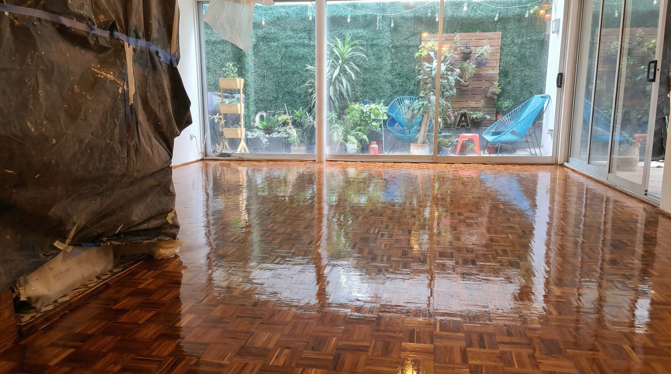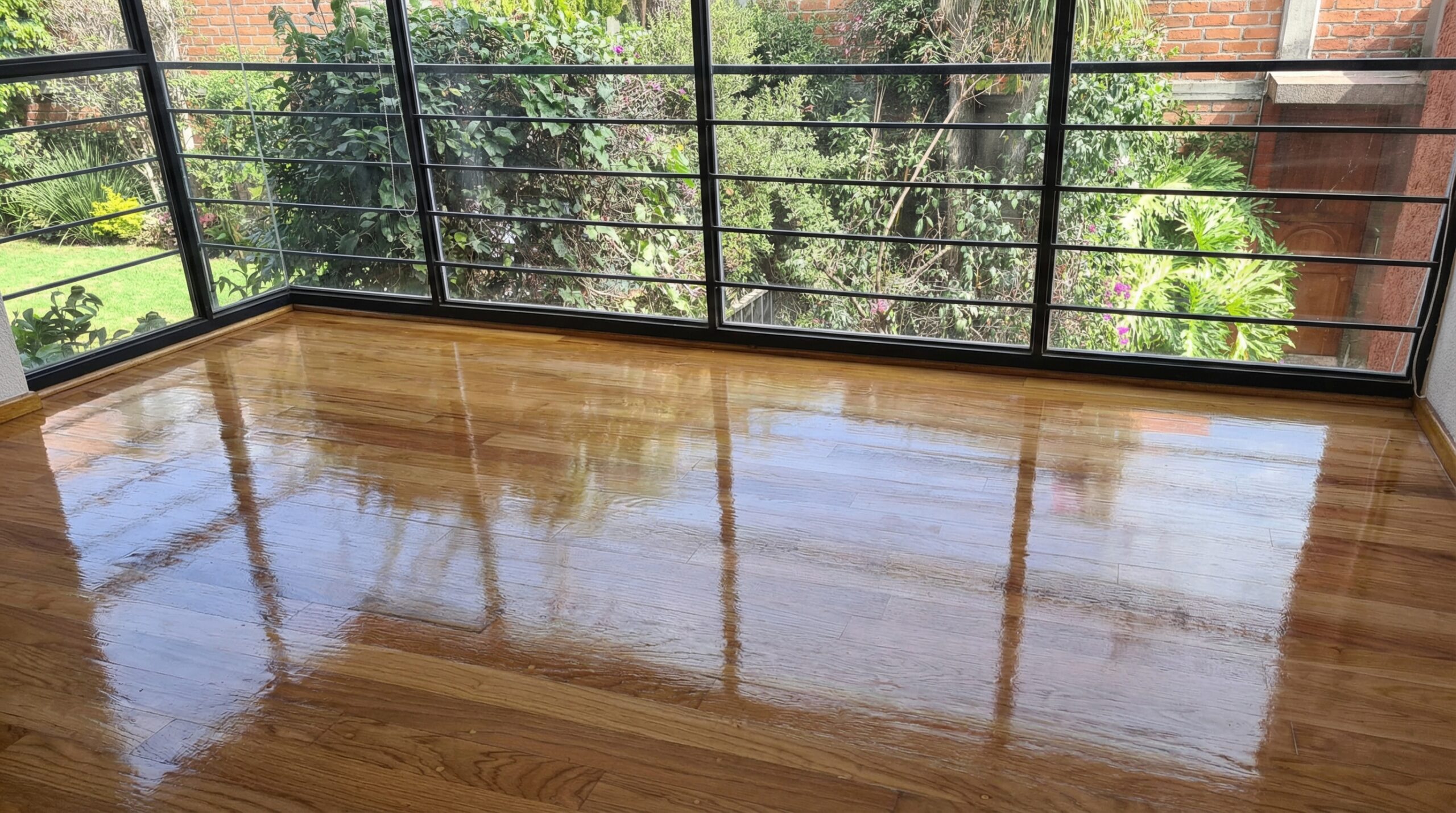 Pulido y barnizado en salón amplio con ventanales.