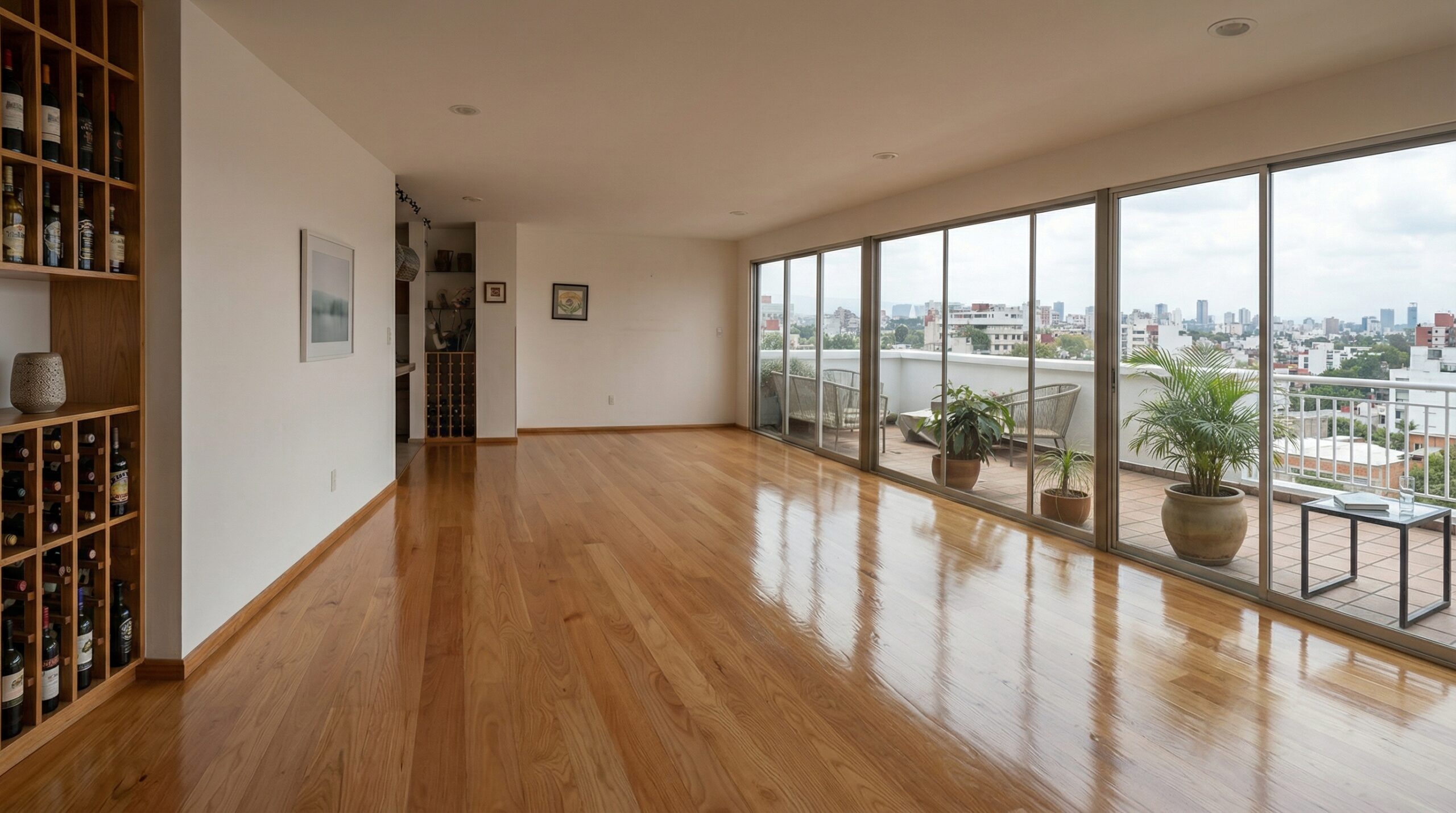 Duela sólida recién barnizada en sala de lujo con vista a la ciudad.