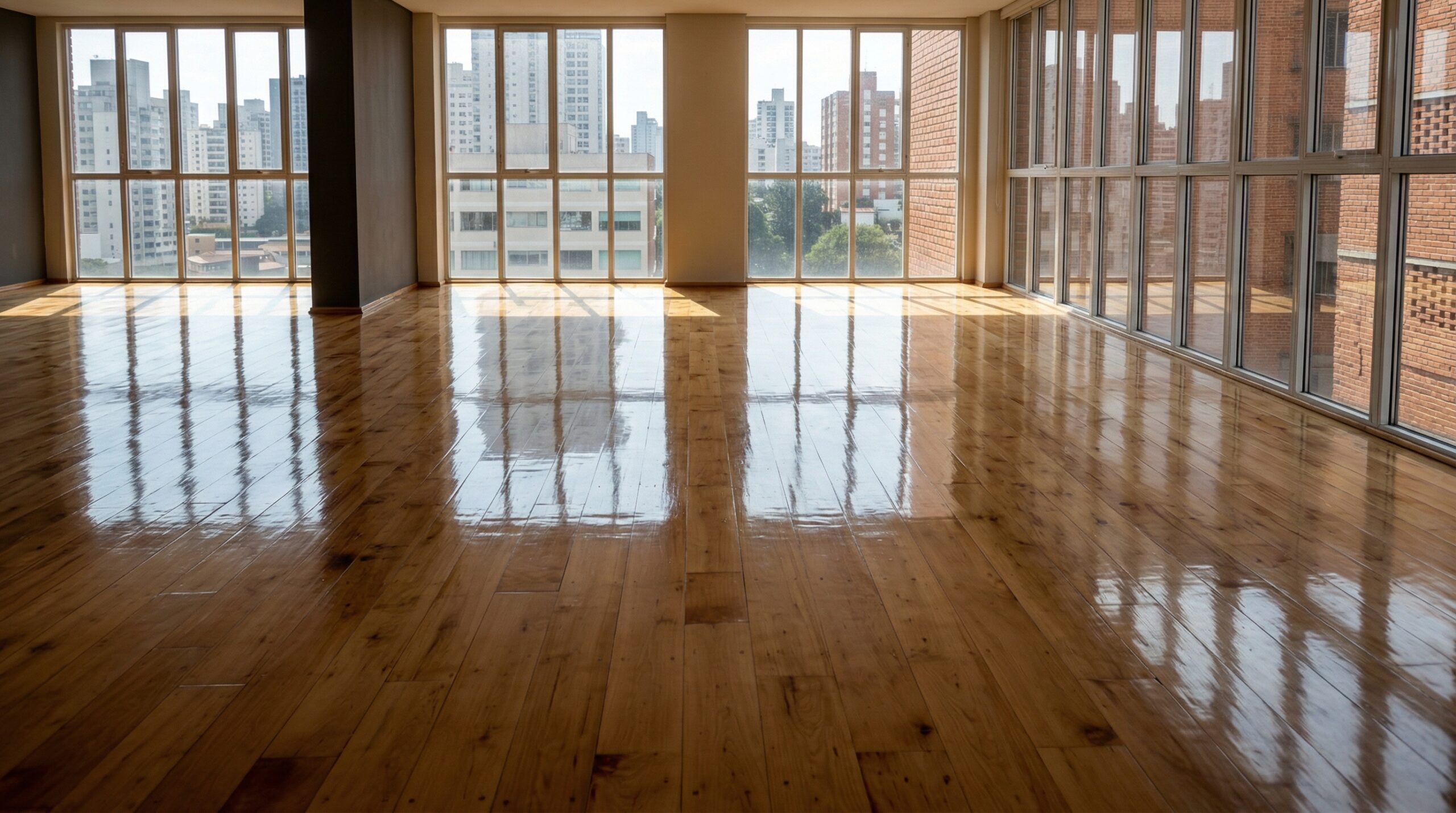 Duela sólida recién barnizada en sala de lujo con vista a la ciudad.